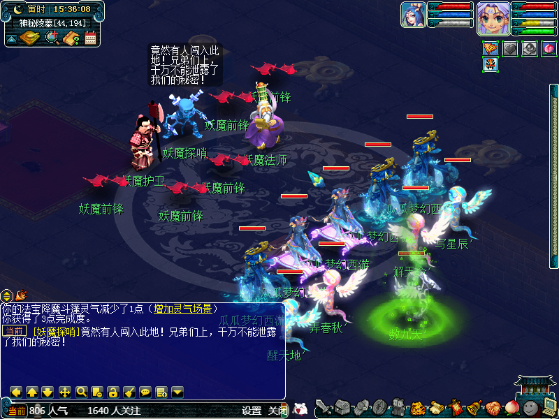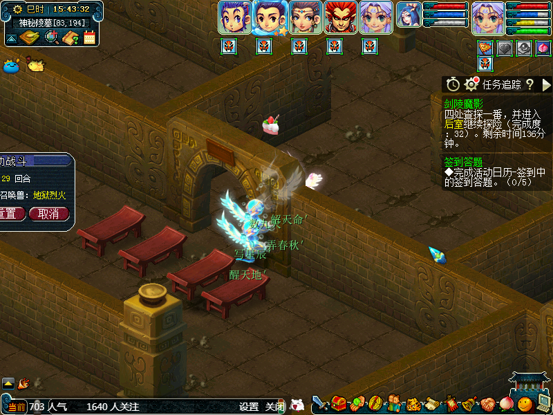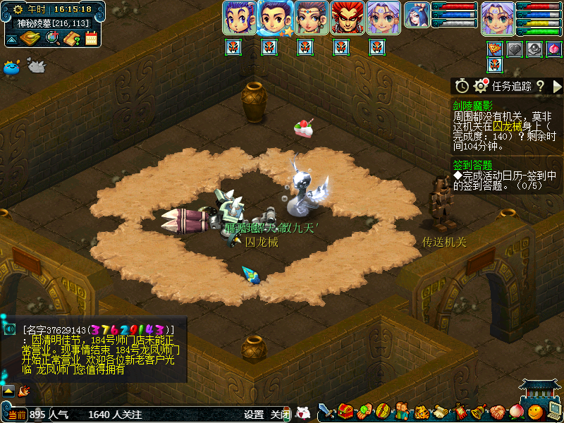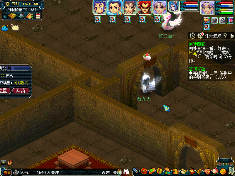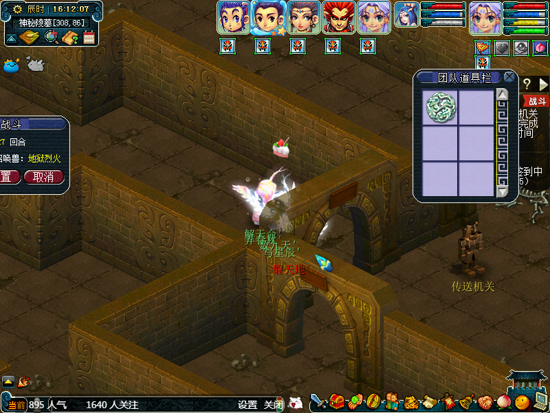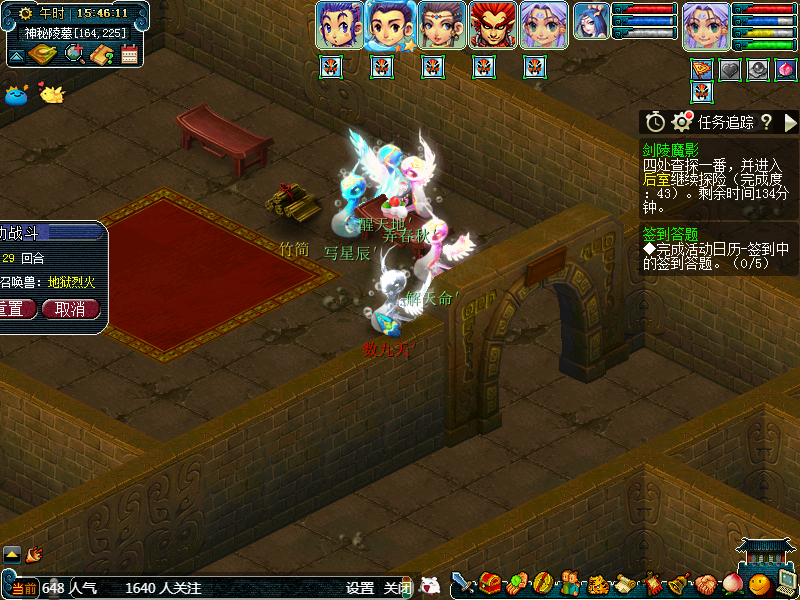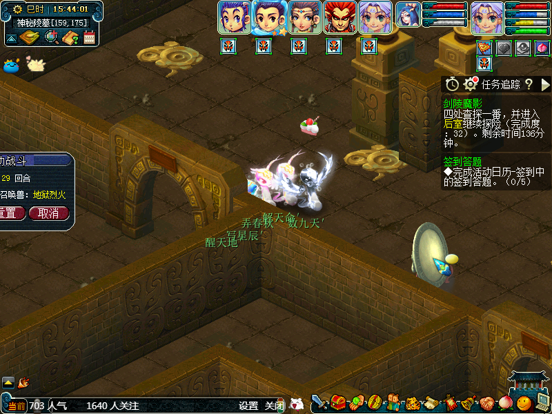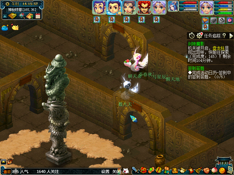 然后我们贴着墙从左向右走,或者从右向左走也可以,这个随意。第一个场景属于答题位置,可以散队答题,获得完成度,这个位置有可能会获得如意丹、宝图等。