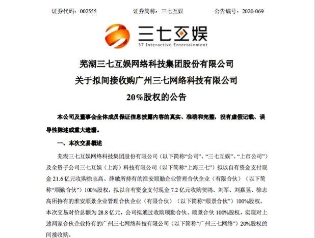 12月7日,三七互娱发布《芜湖三七互娱网络科技集团股份有限公司(简称“三七互娱”)关于拟间接收购广州三七网络科技有限公司20%股权的公告》,公告称,三七互娱及全资子公司三七互娱(上海)科技有限公司(简称“上海三七”)以自有资金拟间接收购广州三七网络科技有限公司(简称“广州三七网络”)20%股权,本次收购总额为28.8亿元。