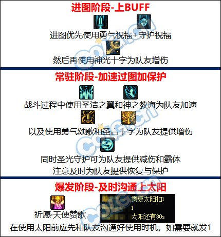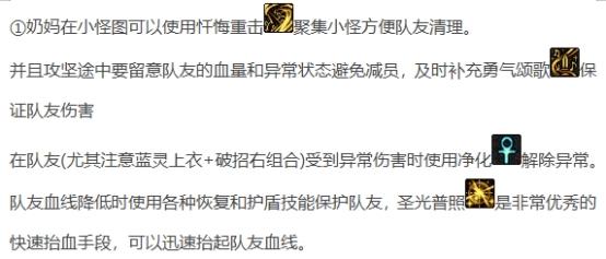 忏悔重击护石减少太阳CD并提供大范围聚怪为必选护石;忏悔之雷护石大幅优化复活范围以及恢复效果,团本必选护石;圣佑之阵可以为范围内的队友提供1.5s的无敌,也可以选择圣洁之源护石提供跑图效率。符文方面绿色勇气颂歌提高圣歌覆盖率,蓝色和黄色圣佑之阵提升无敌的覆盖范围以及使用频率,如不用圣佑之阵护石符文可都选勇气颂歌