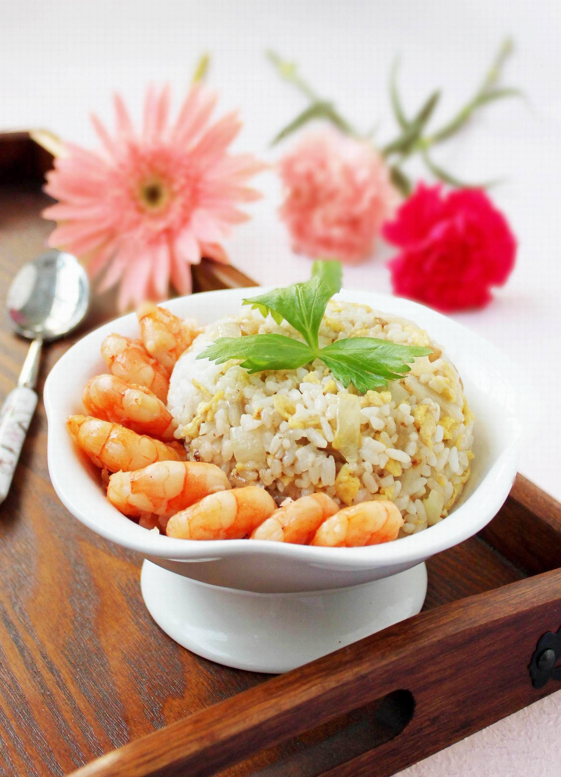 原料:米饭1碗、洋葱半个、虾仁100克、鸡蛋1个。