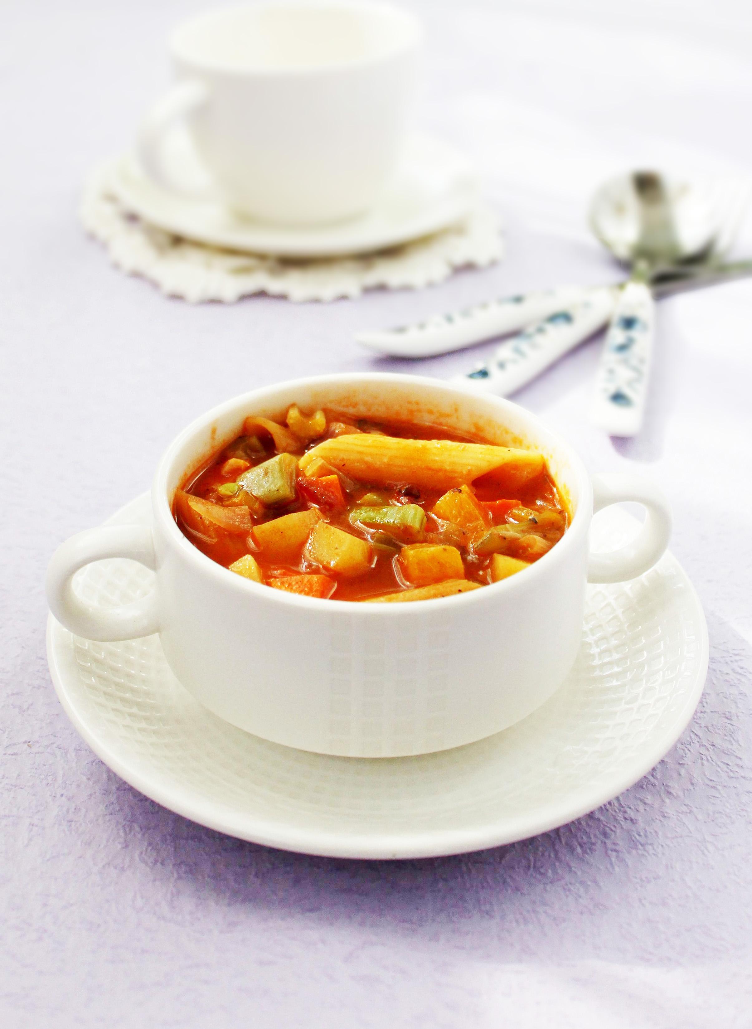 材料:斜管面25克、胡萝卜10克、圆白菜10克、洋葱10克、西芹10克、土豆.10克、 西红柿10克、四季豆10克、黄甜椒10克、培根1片、大蒜2瓣调料:鸡汤1小碗、番茄酱20克、罗勒叶3片、盐、白胡椒粉少