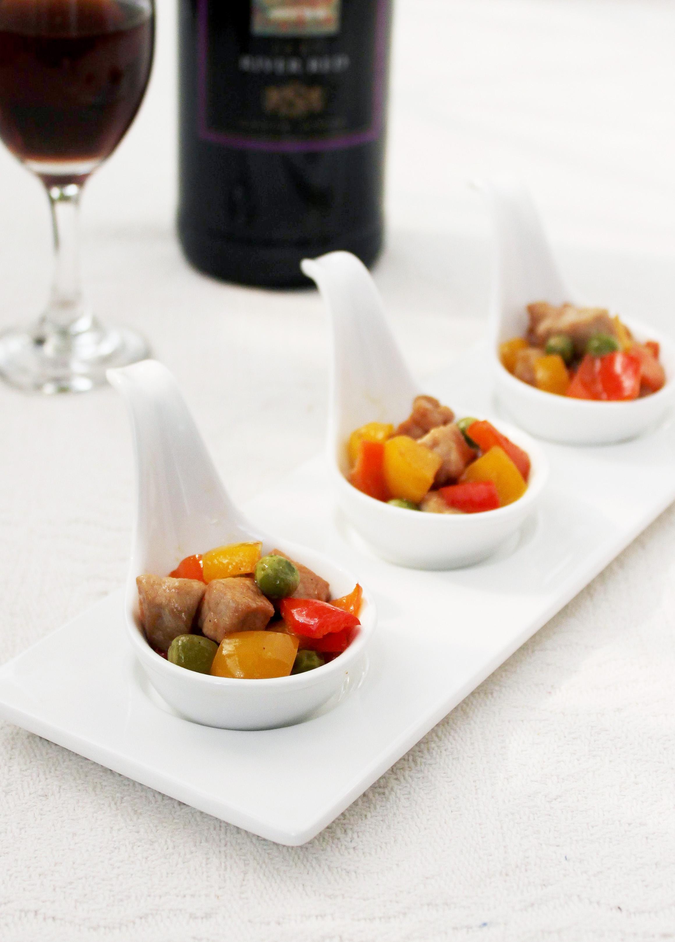 原料:牛里脊200克、红酒150ML,冷冻豌豆20克 红椒30克、黄椒30克、