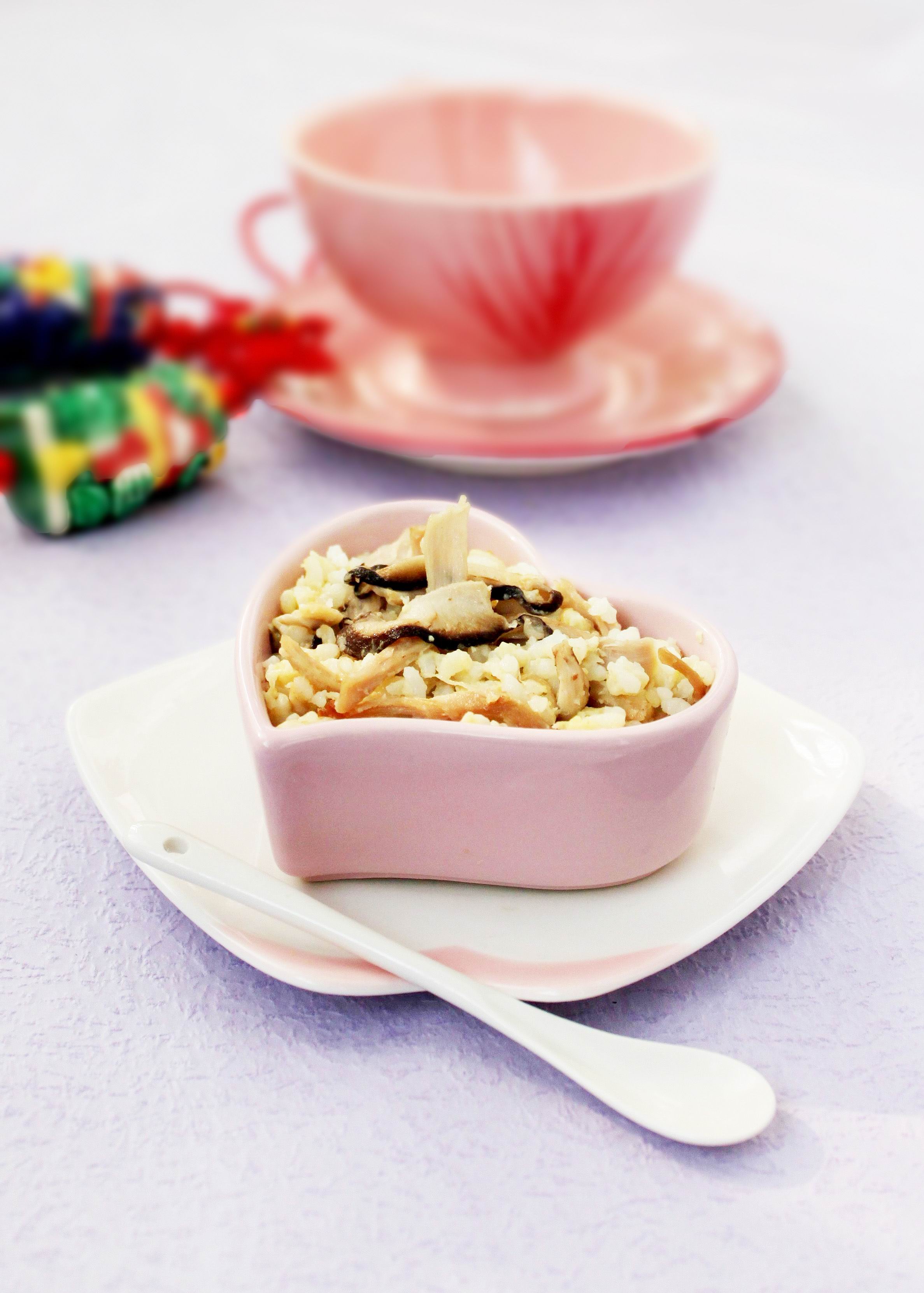 材料:米饭150克、熟鸡丝100克、香菇1朵、鸡蛋1个