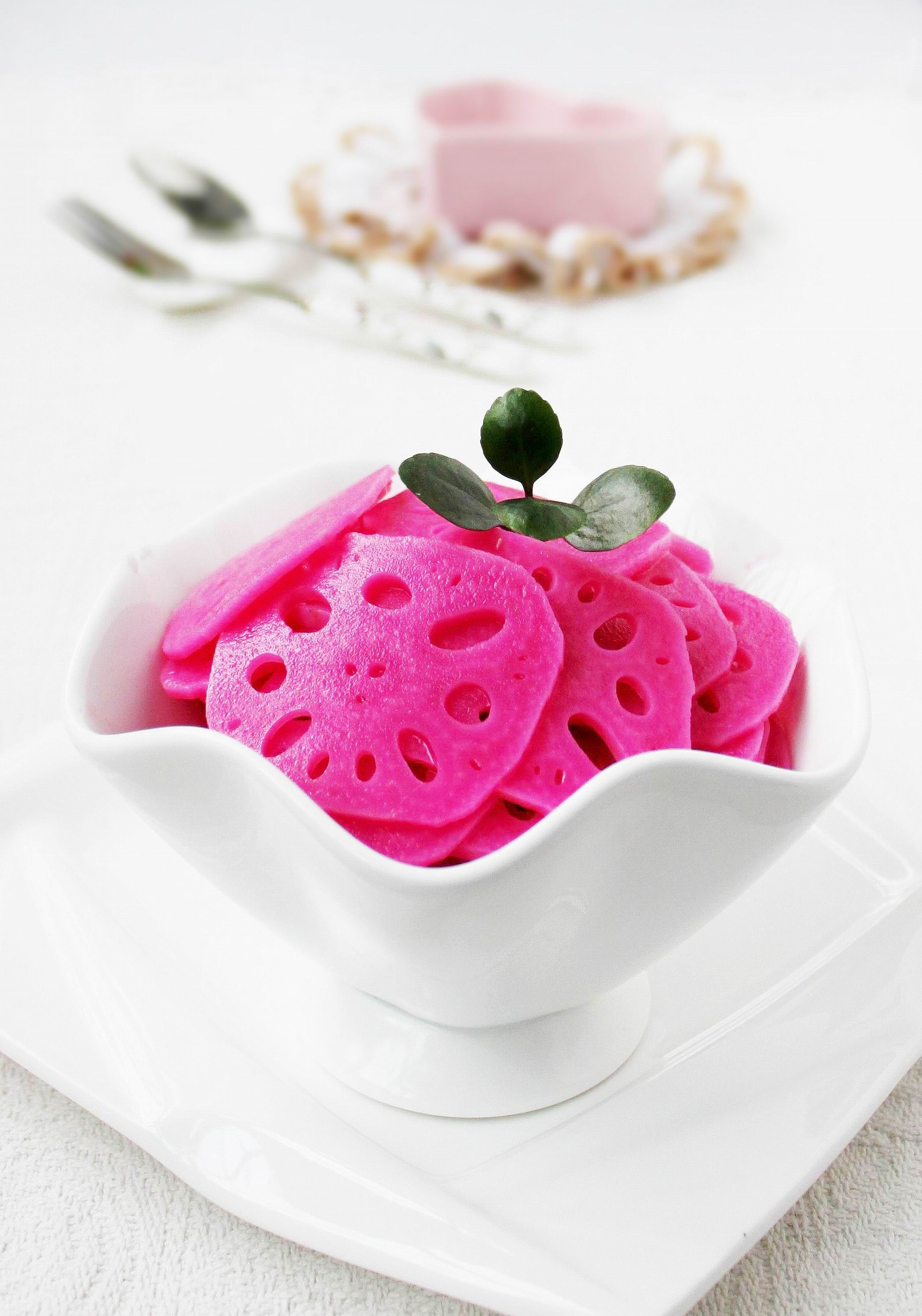 2、若是没有苋菜,可用紫甘兰代替,把紫甘兰打成汁,滴上几滴白醋,即可泡藕,也可出来同样艳丽的模样。