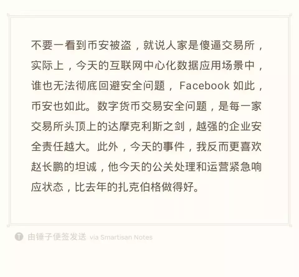 此外,不少公众人物也纷纷表示支持币安。火星财经发起人王峰表示,数字货币交易安全问题是每一家交易所头顶的达摩克利斯之剑,越强的企业安全责任越大,“今天的事件,我反而更喜欢赵长鹏的坦诚”。