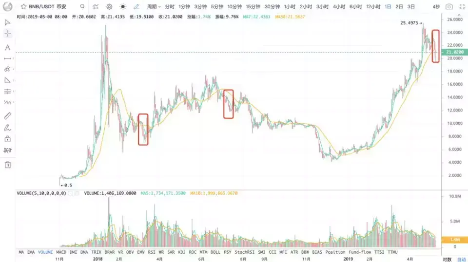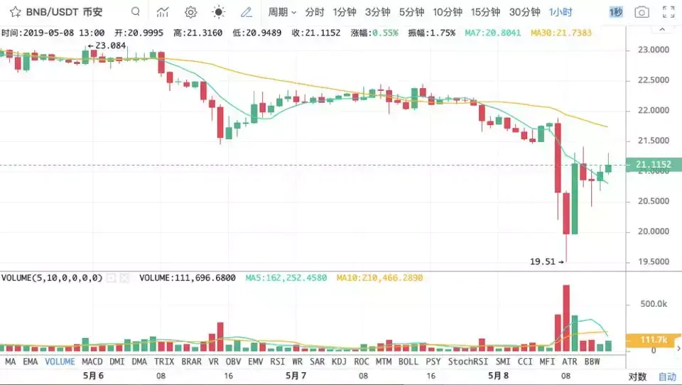 并且与此前两次事件不同的是,黑客已经成功从币安钱包中提取了BTC。若这7,000枚BTC流入市场,将会对市场造成一定影响。而BTC在昨晚短暂突破6,000美元后遭到上方高压影响,大幅下调回到5,900美元左右,而受到币安被盗事件影响,BTC再次下跌,最低至5,772美元。但是从目前行情来看,BTC在5,800美元下方承接力机枪,BTC已经反弹回到5,800美元上方震荡,此事件对BTC价格影响较弱。而BNB在震荡下跌11%,至19.51美元低点后反弹,撰稿时已回到21.1美元。