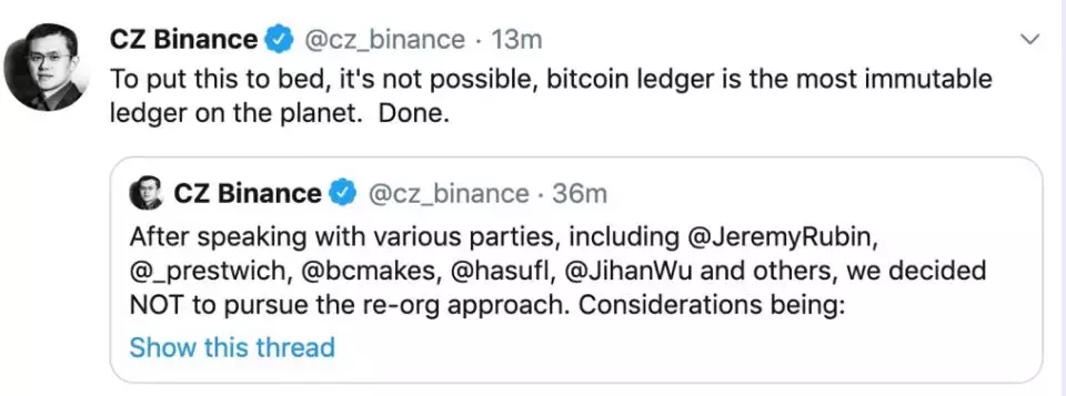截至发稿,币安CEO赵长鹏在推特中表示,经过与多方讨论后币安决定不采用重组(re-org)的方式恢复被盗资金,主要考虑因素包括: