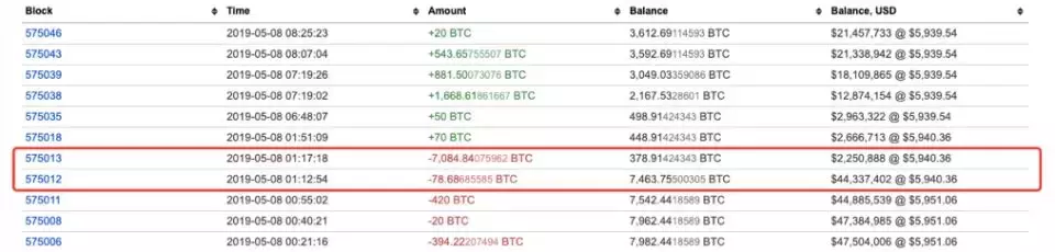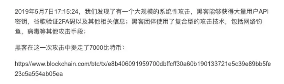 北京时间5月8日凌晨1:17,比特币区块高度575013打包了一笔7,074.19枚BTC的交易;北京时间5月8日7:34,币安发表英文公告,表示检测到大规模的系统性攻击,并被黑客盗走了7,000枚BTC。