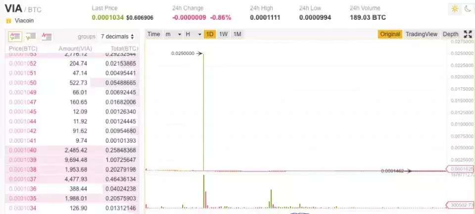 据报道,黑客用大约1,000枚BTC(未证实)买单将VIA价格从0.000225美元短时推高100多倍至0.025美元,随后抛售换回BTC并计划转出至预先准备的账号中提走。但币安在后续报告中表示,VIA波动开始的2分钟内,系统检测到VIA/BTC交易对异动,触发风控,自动停止了提币,且无资金逃离。