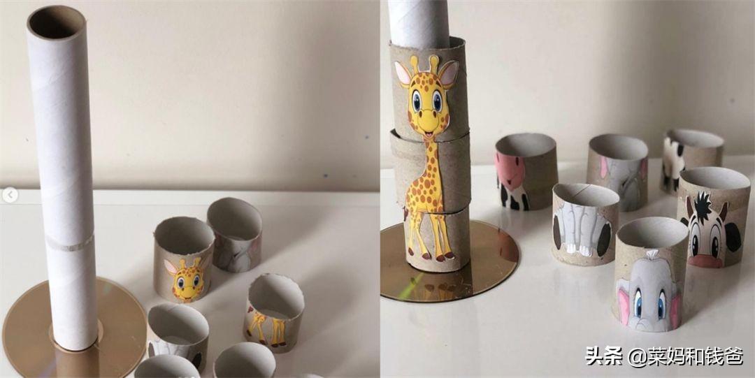 家里的卷筒纸罐可以留下,或是普通的卡纸,做成3个(或2个)大小相同的圆环。打印好的小动物的形象,剪下来后一分为三(或二),分别贴在圆环上。再准备一个保鲜膜的长圆筒,固定好之后,就可以让宝宝开始拼图啦!