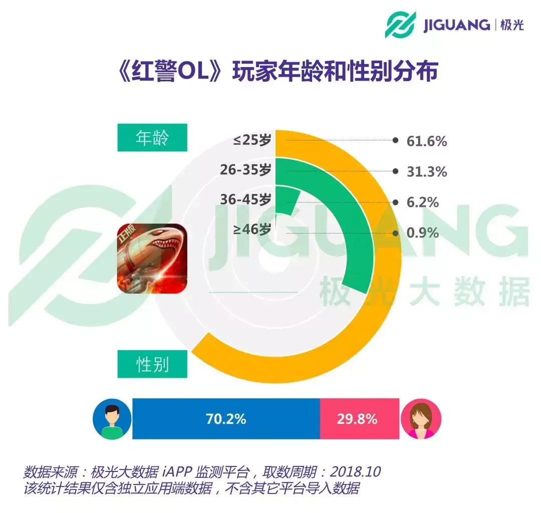 极光大数据也揭示了《红警OL》的一些用户数据。比较令人意外的是,《红警OL》的用户以25岁及以下的年轻玩家为主,占比高达61.6%。其次为26-35岁玩家,该年龄段玩家的占比为31.3%。而《红警OL》玩家中有70.2%为男性,女性玩家占比29.8%。