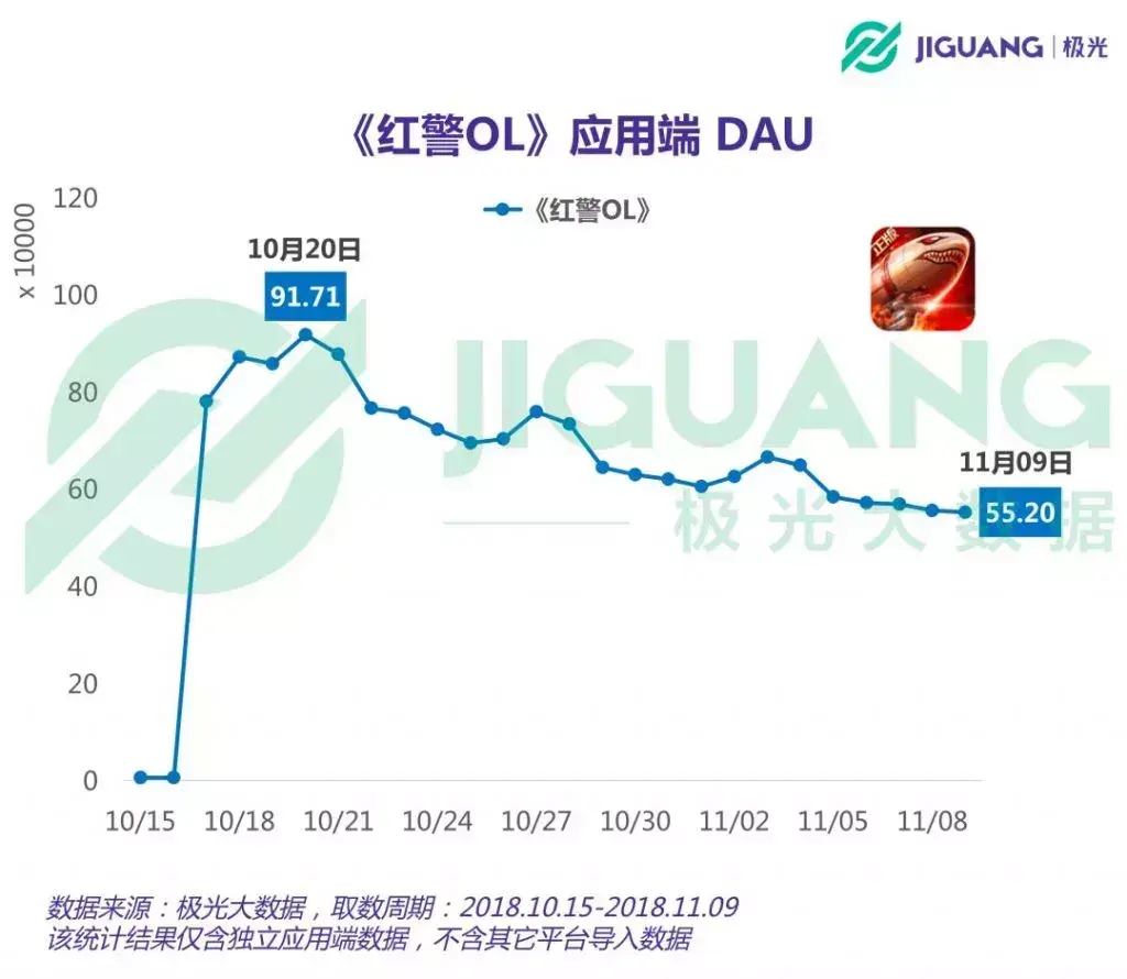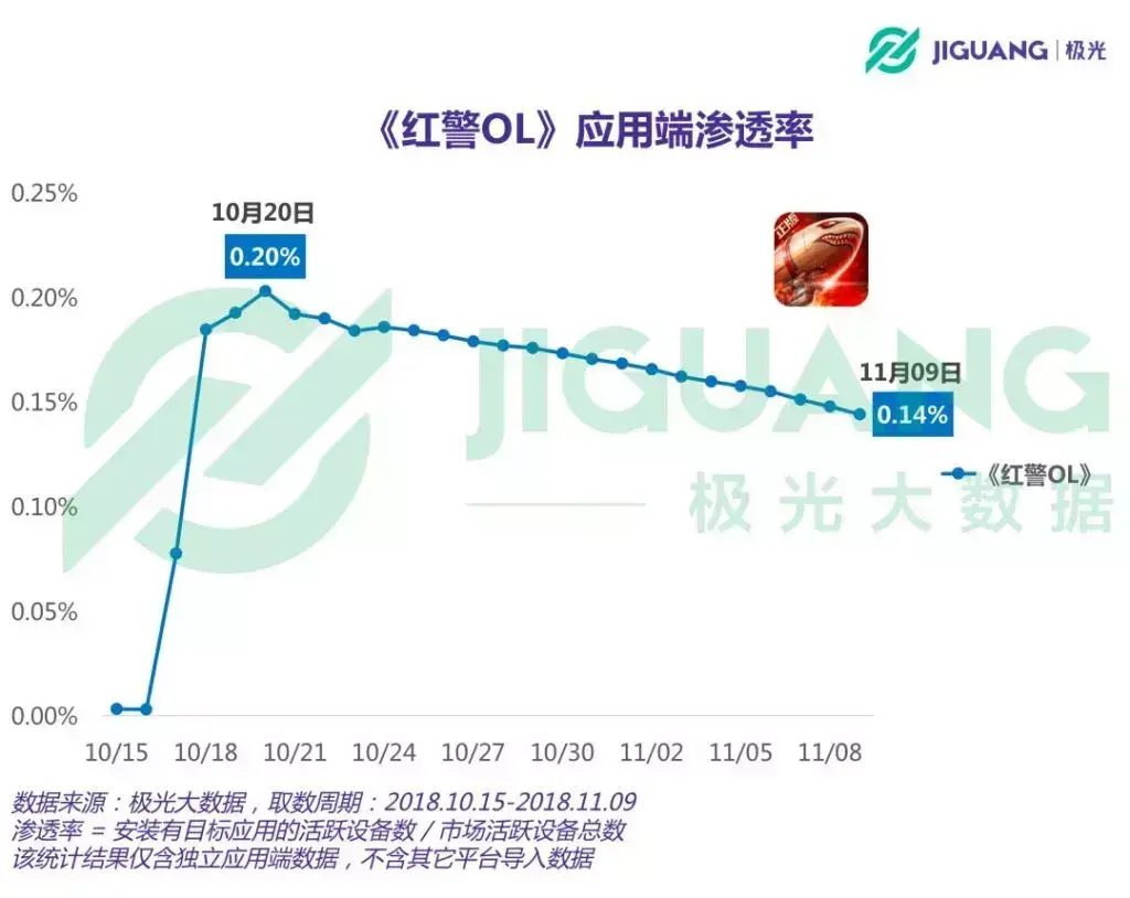 极光大数据报告显示,在10月20日,《红警OL》的DAU和渗透率均迎来了阶段性高点,DAU为91.71万,渗透率达到了0.2%。