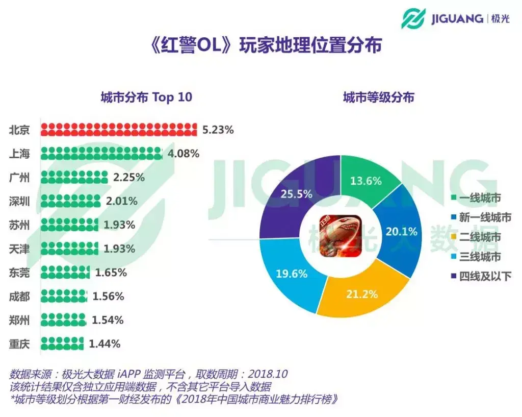 在分布城市方面,《红警OL》有13.6%的用户分布在一线城市,新一线和二线城市的玩家占比分别为20.1%和21.2%,另外还有25.5%的玩家分布在四线及以下城市。