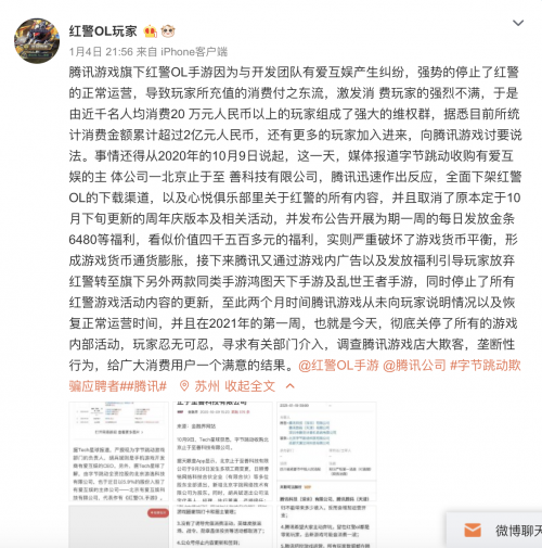 今年1月4号,微博名为“红警OL玩家”的用户发文称:“腾讯旗下《红警OL》手游因与开发团队有爱互娱产生纠纷,强势停止了该款手游的正常运营,始终未说明恢复正常运营的时间,且在4号当天彻底关停所有游戏内部活动,导致玩家所充值的消费付之东流。”文中同时认为“玩家忍无可忍”,腾讯游戏是“店大欺客”。