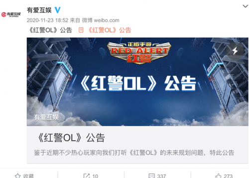 2020年11月23号,《红警OL》开发商有爱互娱在官方微博针对2周年庆典活动(原定于2020年10月下旬推出的活动)未如期更新、游戏的未来规划等问题发布了一则公告。