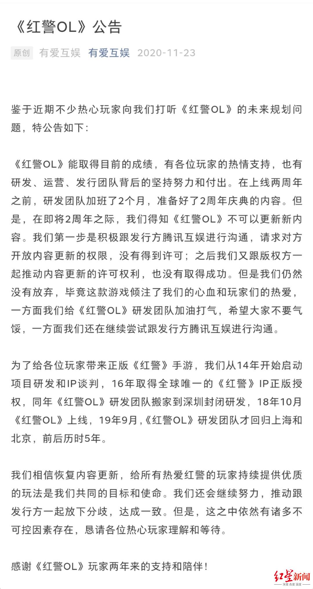 去年11月24日,北京有爱互娱科技有限公司的官网发布了“《红警OL》公告”,称:“在即将2周年之际,我们得知《红警OL》不可以更新内容。我们第一步是积极跟发行方腾讯互娱进行沟通,请求对方开放内容更新的权限,没有得到许可;之后我们又跟版权方一起推动内容更新的许可权利,也没有取得成功。”