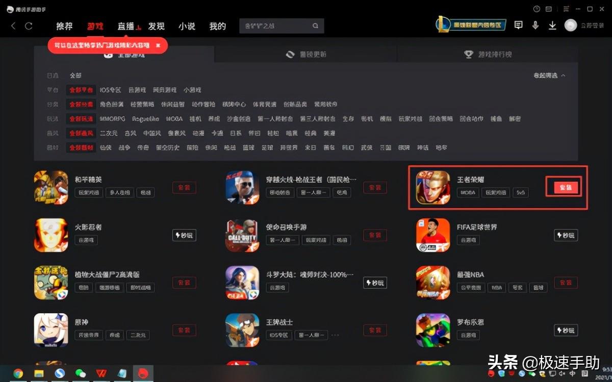 3、接着,在众多的游戏当中,找到自己想要玩的游戏,比如【王者荣耀】,然后点击其右侧的【安装】按钮。