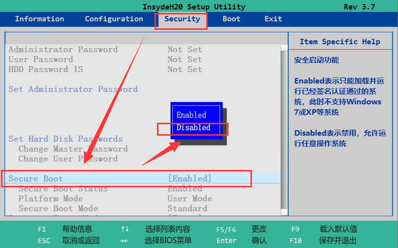 2、 进入BIOS后,通过方向键切换到Security选项,设置Secure Boot为Disabled(禁用),表示关闭安全引导。