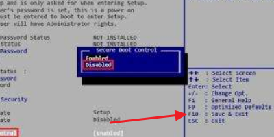 重启笔记本,出现开机画面时按下F2键,通过键盘方向键将光标移动到“Security”,选择“Secure Boot Control”后按下回车键,修改成“Disable”