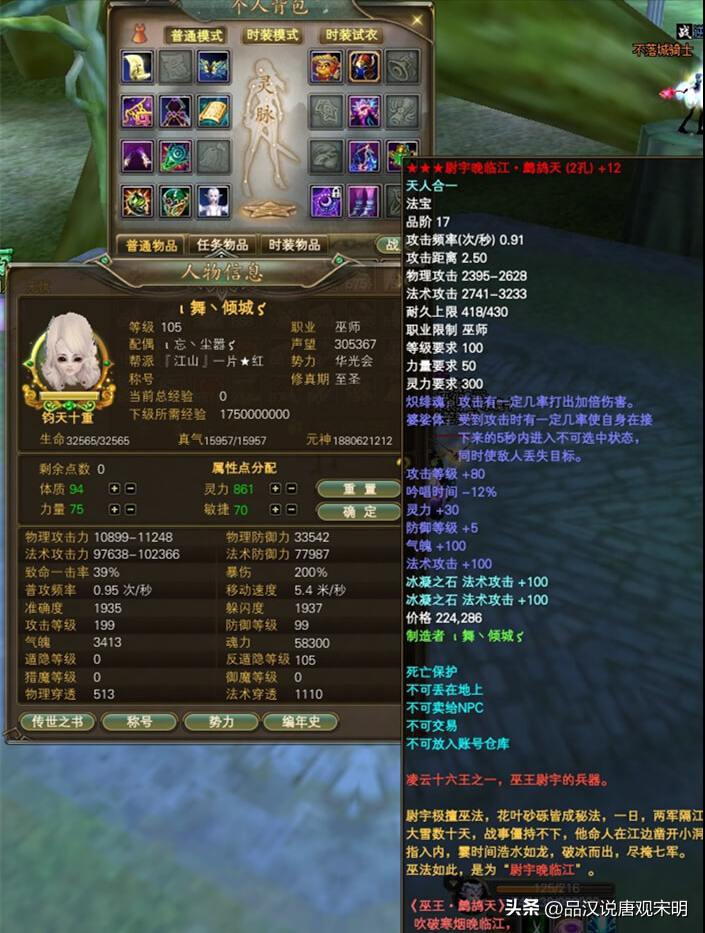 例如下面这样的一个角色,别的不说,光是手里这把17品武器,价格至少就是5万起步。而全身所有的装备算下来至少要30万以上。整个角色的投入成本不会低于50万元。
