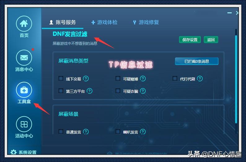 其实,当你发现一些玩家,在团本宣传非法程序,也可以进行举报,TP的处理速度,还是比较快的。“DNF信息过滤”功能,在各种类型后面“打勾”,设置好之后保存,那些令我们十分讨厌的内容,就不会出现在游戏中,真的是一个很强大的便利性功能!