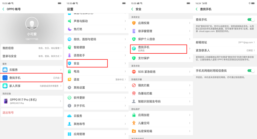 首先,我们可以通过【设置】中的第一行找到【查找手机】,也可以通过【设置】-【安全】找到【查找手机】。