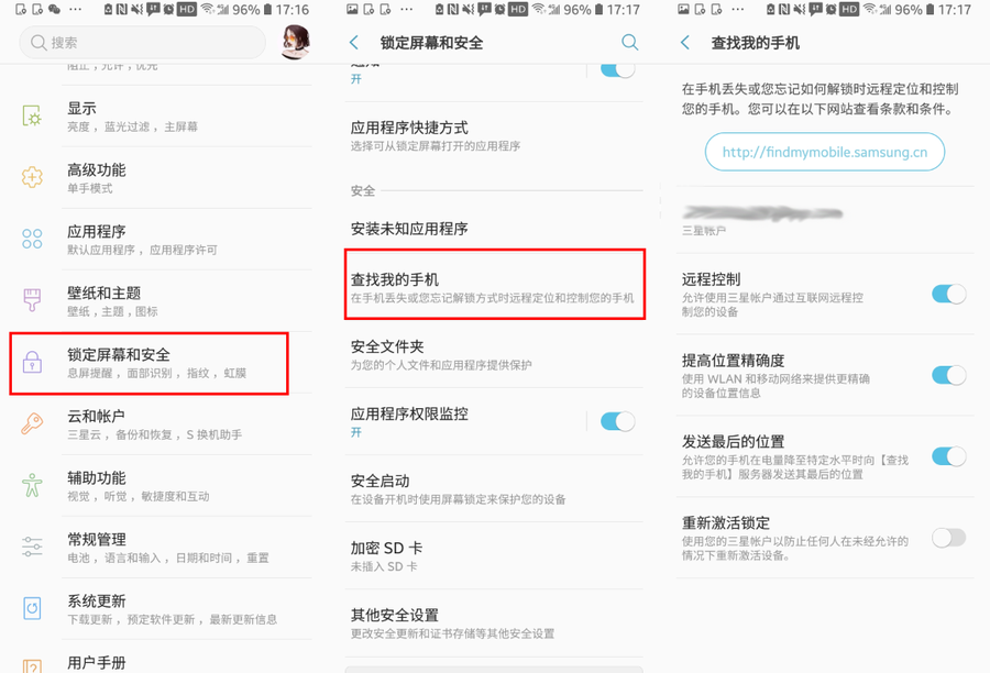 三星手机通过【锁定屏幕和安全】找到【查找我的手机】,并开启远程控制选项。手机丢失后进入网址。