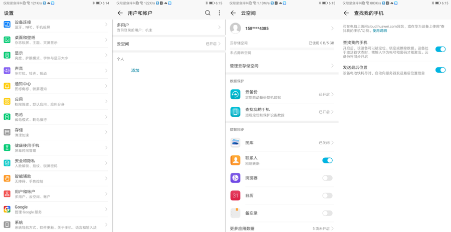 在【设置】-【用户和账户】-【云空间】中找到【查找我的手机】,并开启此功能。