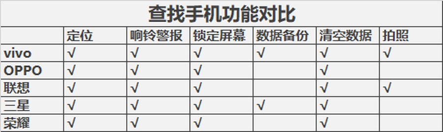 有几个功能是所有品牌手机必备的:定位、播放铃声、锁定屏幕和擦除数据。播放铃声的功能:所有手机都是将铃声自动调到最大,不间断播放三分钟。经过测试,各家的手机铃声并不是我想象的那种特别直入人心的警报,相反都很好听。在安静的地方很清晰,如果是在闹市,能找到的可能性就很小了。