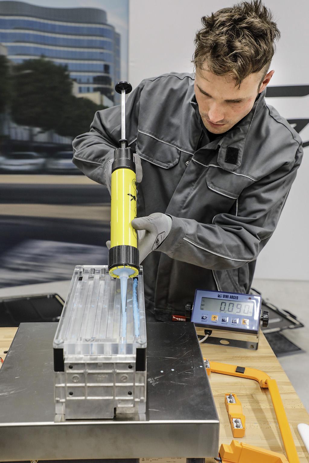 接着将新模块连同触点一起安装。经过适当的调节后,电池外壳用特殊的粘合剂密封。接下来进行质量检查,直至完成工作。