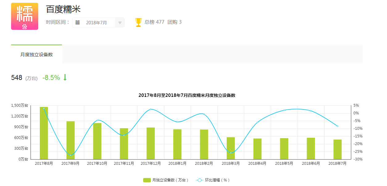 以上者两个图分别是大众点评和百度糯米APP月度独立设备数的数据,从上面数据我们可以清楚的知道,使用大众点评的人数显然比使用美团的人数多了一个数量级。在APP总榜排名上大众点评可以说是排在较前的位置,而百度糯米基本上已经是处于吊车尾了。