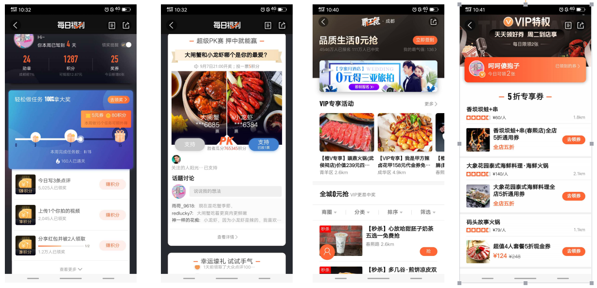 用户个人成长:每日福利、PK赛、霸王餐、VIP特权等。