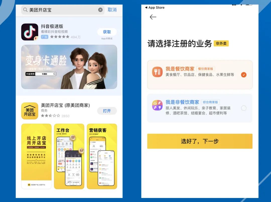 第一步:商家入驻美团商家,可以应用商城直接搜索“美团开店宝”并进行注册