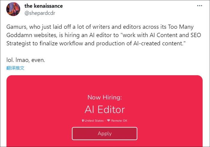 Gamurs在裁员后不久就发布了一则招聘AI编辑的启事,要求熟练使用SEO和AI等工具创作高质量内容,每周至少产出200至250篇文章