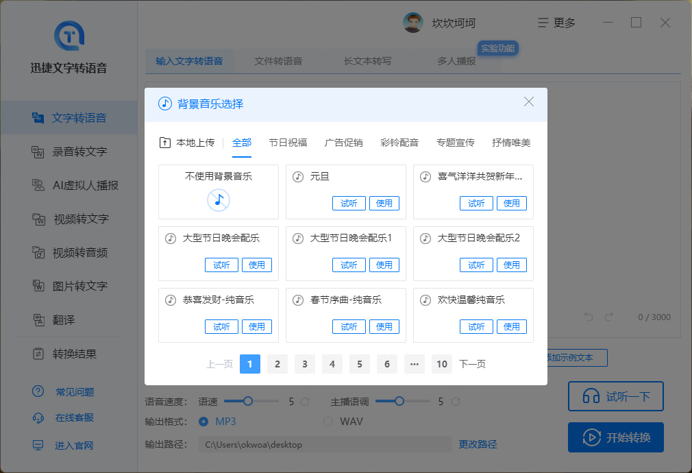 打开软件——点击【文字转语音】——将需要配音的文本输入到文本框中后,选择需要的主播类型——调整主播音量、语速、语调等参数——点击【开始转换】。