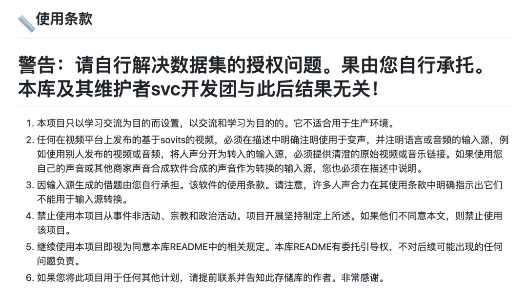 对版权的担忧,其实早在AIGC音乐大规模推出前就已出现。“So-VITS-SVC 4.0”产品界面上,即有如下警告: