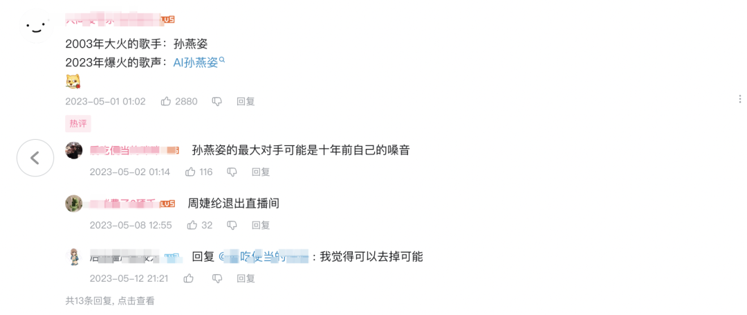 “AI孙燕姿”顺势成内容标签、自媒体创作风口,不论是音乐垂直账号,还是娱乐营销号。或搬运或自制,都开始参与到“AI孙燕姿”之中,分享着流量红利。