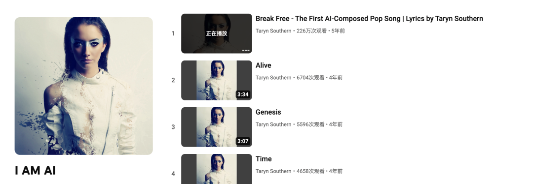 2017年,歌手泰琳·萨顿(Taryn Southern)与人工智能软件合作推出专辑《I AM AI》,参与这一项目的人士预言,“音乐的未来将在人与人工智能的合作之间创造。”