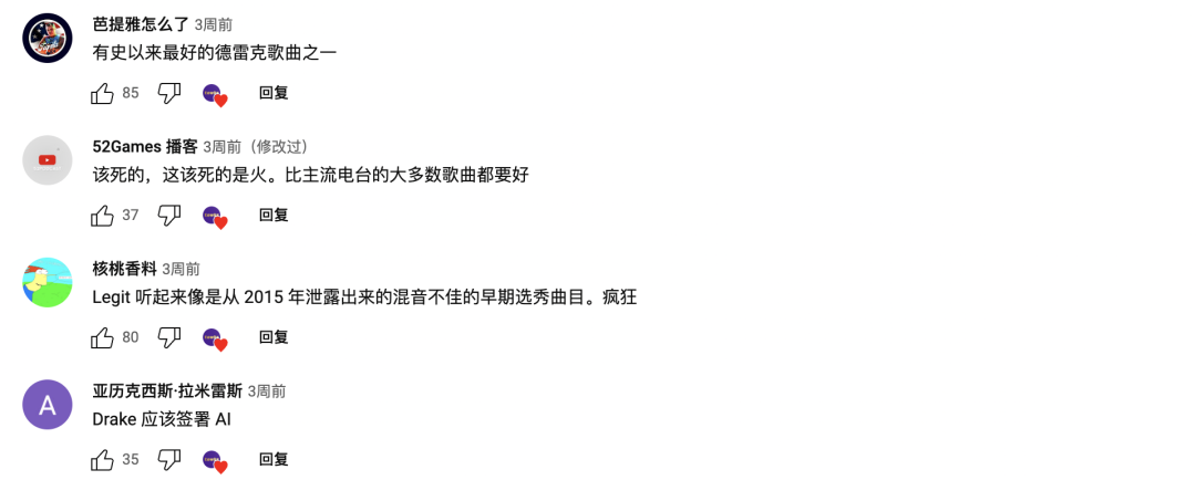 此前在国外,一首合成了歌手Drake和Weekend音色的AIGC歌曲《Heart on My Sleeve》上线Youtube平台。但随后,歌手方唱片公司环球音乐要求平台进行下架处理,并发问,“是要站在艺术家、粉丝和人类创造性表达的一边,还是站在Deepfake、欺诈和拒付艺术家赔偿的一边?”