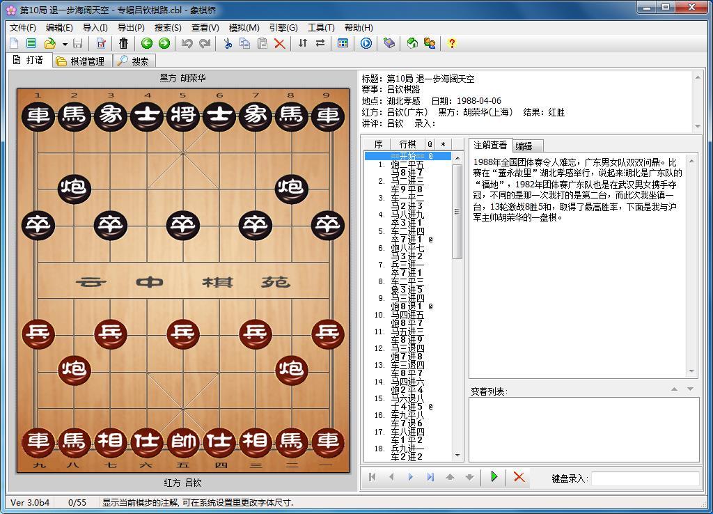 象棋桥是用于中国象棋棋谱管理的免费软件,软件易学易用、界面美观,集棋谱欣赏、研究、记录、搜索、管理于一体,支持简体中文和繁体中文两种界面。他有着强大的编辑功能,可以创建出任何需要的棋谱;人性化的模拟对弈,用来记谱是再好不过了;极高的搜索速度,在列出结果的同时,还列出了搜索盘面的所有变化。不仅如此,它还支持大部分流行的棋谱格式,如XQF、PGN、MXQ、CBR、CBL等。我用的版本正是云中棋苑的美化版,集成了三种漂亮的界面和上万棋谱。先别急,后面会免费给大家哦。先来一睹象棋桥云中棋苑版的界面: