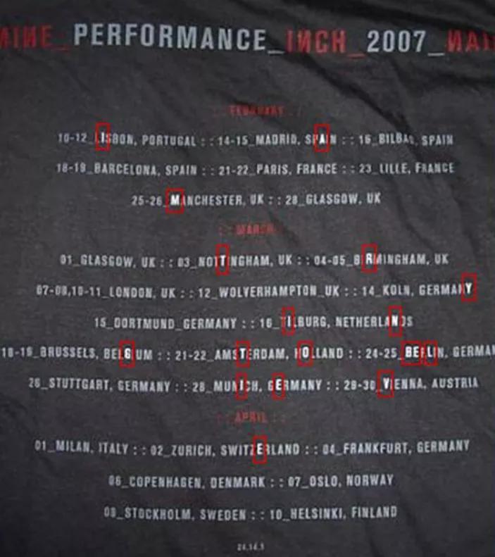 当然,它也不会完全拘泥于视频形式,比如有一个叫 Year Zero 的 ARG 游戏,它的 “ 入口 ” 隐藏在一个叫九寸钉乐团的美国工业金属乐队的巡演纪念 T 恤上。