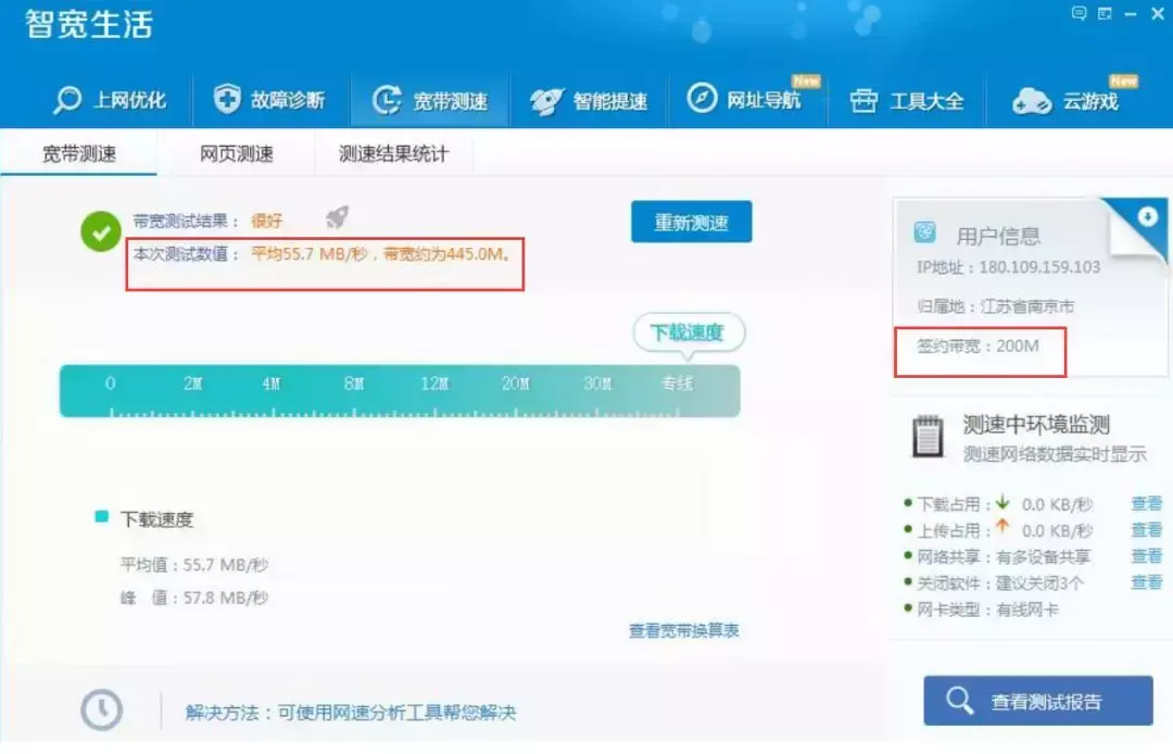 双200M网速测试结果,平均55.7MB/s,带宽约为445M,属于正常,如果你测试的结果和下面测试结果相差很多,那说明网络有问题。