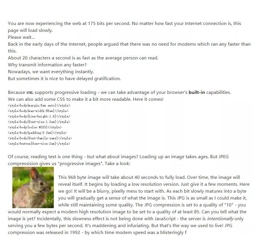 于是乎他设计了这个行为艺术网页,每秒只加载 20 个字符,用代码来控制你的阅读速度。除非你上过量子波动速读班,不然普通人认字就差不多这效率。