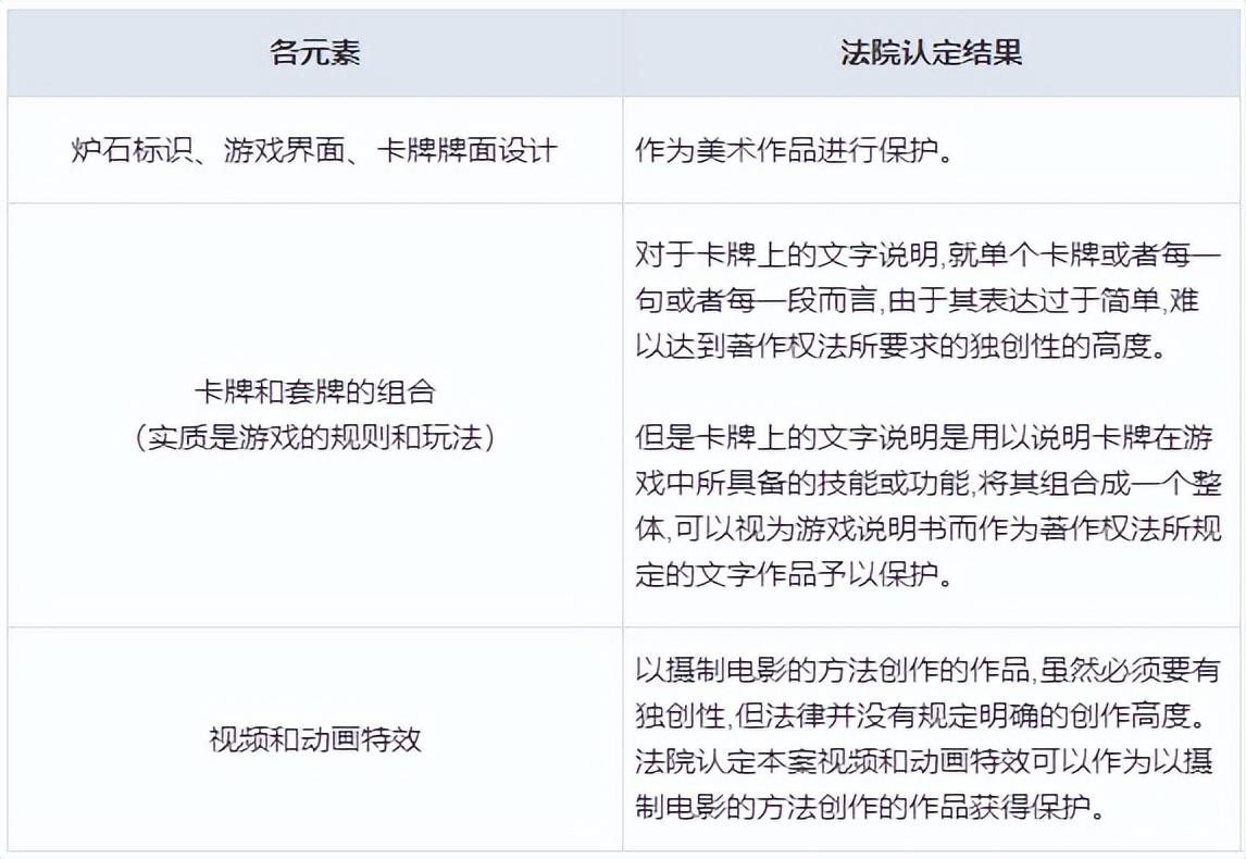 例如,在暴雪娱乐有限公司、上海网之易网络科技发展有限公司与上海游易网络科技有限公司著作权权属、侵权纠纷一案[5]中,原告主张保护炉石标识、游戏界面、卡牌牌面设计、卡牌和套牌的组合、视频和动画特效五类作品,具体如下: