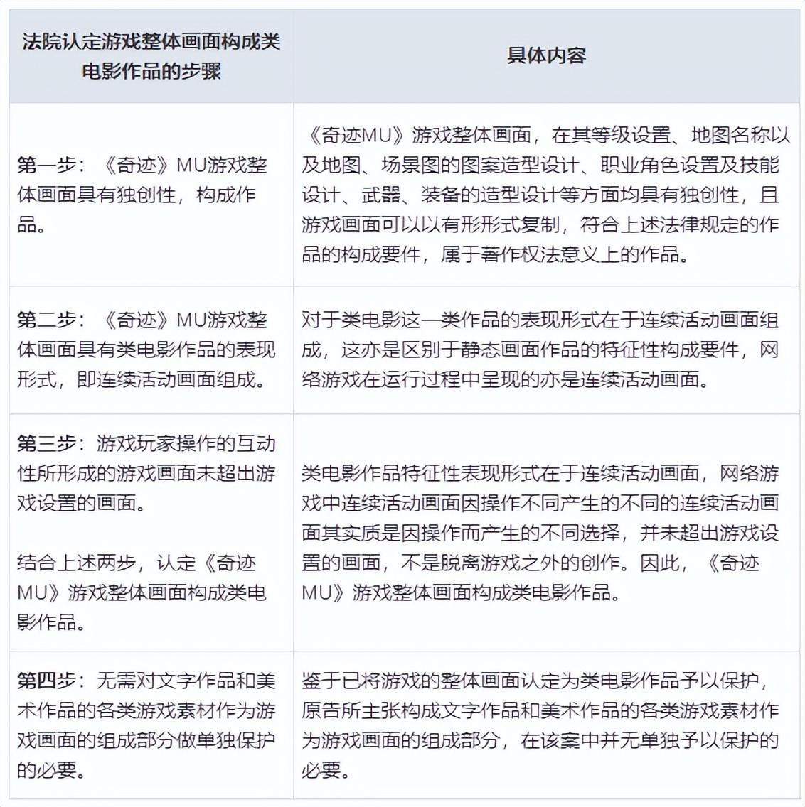 又如,在苏州仙峰网络科技股份有限公司与上海恺英网络科技有限公司、浙江盛和网络科技有限公司侵害著作权纠纷、不正当竞争纠纷一案[13]中,法院认为,游戏特定玩法规则和情节是构成游戏的核心,其通过游戏界面或连续动态画面呈现的具体表达也是玩家所感知的游戏主要内容,将该部分内容作为核心组成部分并对游戏整体适用类电作品法律规则予以保护 ,有利于实现对网络游戏著作权的充分保护和实质保护。