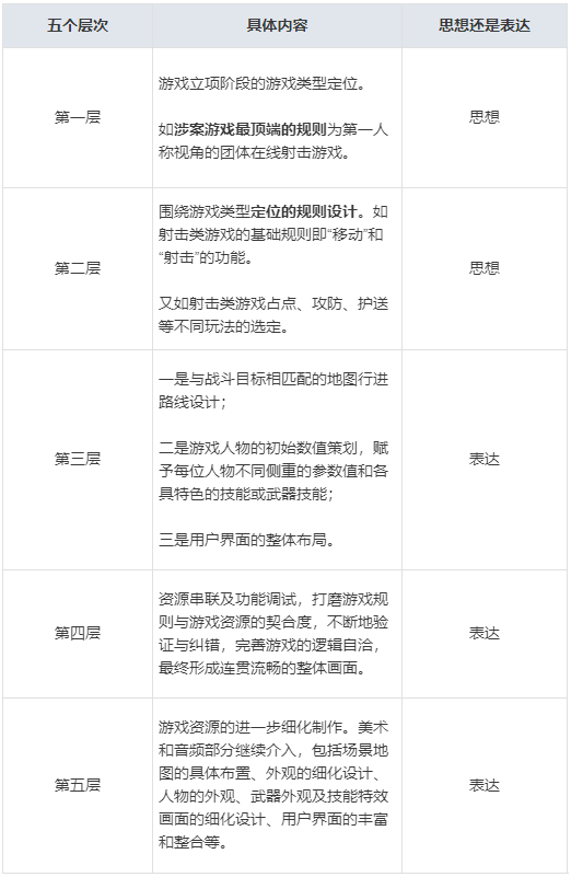 而这些游戏设计要素,大部分存在于第三层的设计中,并且在第四层的资源串联里与游戏的规则融合。游戏规则通过以游戏设计要素为内核的游戏资源制作得以外在呈现,这种外在呈现即表达。因此,游戏地图的行进路线、地图进出口的设计、人物的类型、技能和武器组合等整体构成了对FPS游戏规则的具体表达。