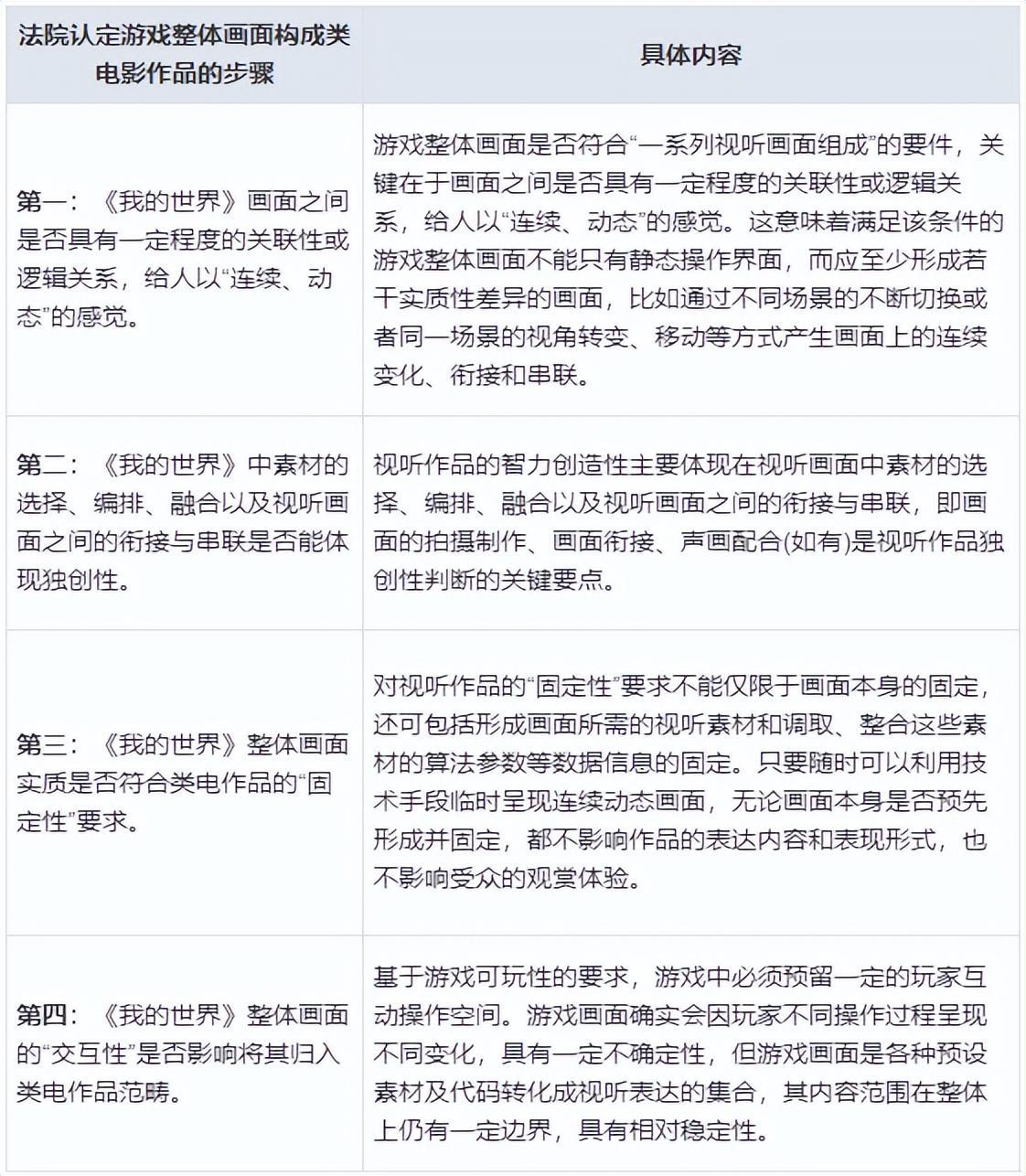 再如,在广州网易计算机系统有限公司、深圳市迷你玩科技有限公司、上海网之易吾世界网络科技有限公司侵害著作权纠纷、不正当竞争纠纷一案[4]中,法院在认定原告的《我的世界》是否构成类电影作品时,从以下四个方面进行考量: