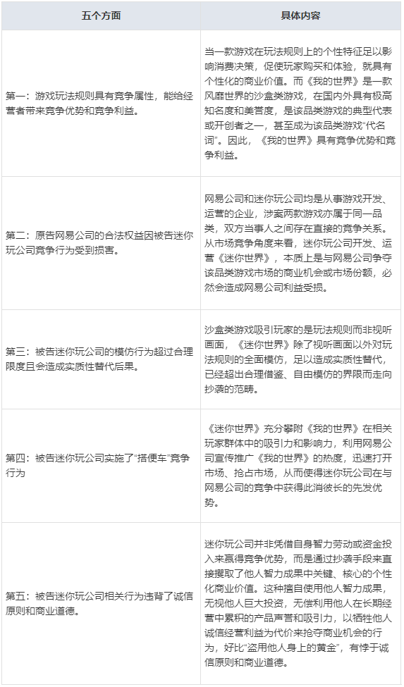 在广州网易计算机系统有限公司、深圳市迷你玩科技有限公司、上海网之易吾世界网络科技有限公司侵害著作权纠纷、不正当竞争纠纷一案[15]中,法院首先认定《迷你世界》整体抄袭了《我的世界》游戏玩法规则。其次,法院从以下五个方面进行分析认定被告是否违反《反不正当竞争法》: