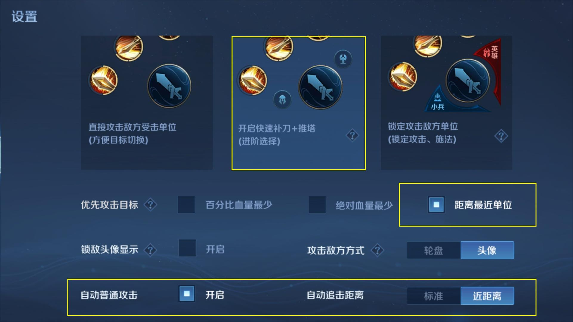 在操作的设置方面,勾选进阶版的自由攻击模式,开启自动普通攻击,将自动追击距离滑动到近距离,进一步防止鬼畜。