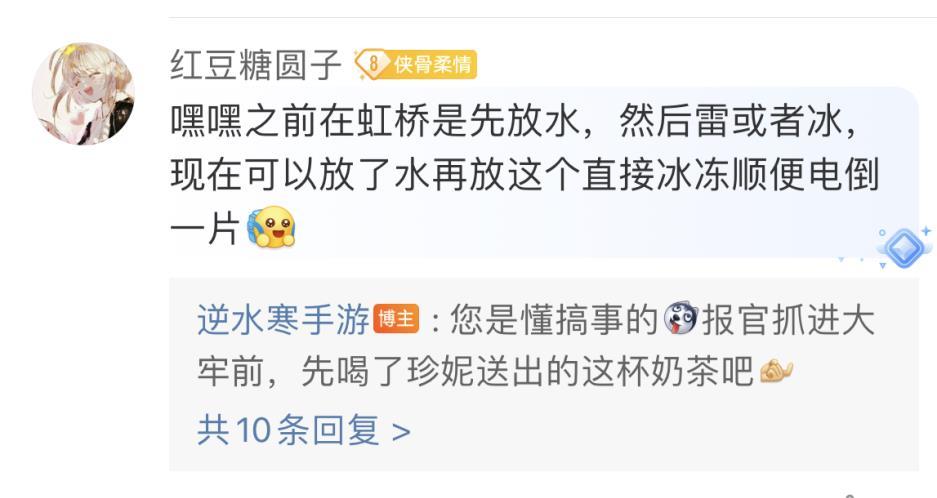 玩家们可以使用承影剑凝结霜雷台,踏空而行,或者借霜电为承影充能,御剑飞行。玩家们还可以利用冰雷反应解锁各类全新宝箱和阵法,自由组合,增加游戏的可玩性。各种神奇的元素反应也让玩家们脑洞大开,不少玩家开始发挥自己的想象力,提出了各种有趣的建议。总的来说,玩家们对《逆水寒》手游1.2版本充满期待。